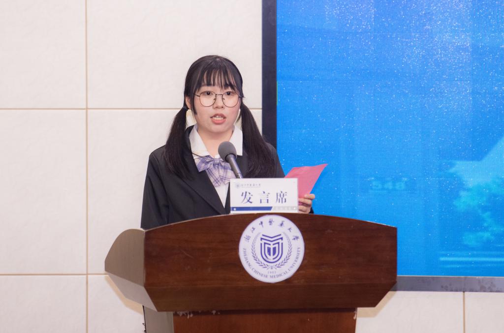 来自2021级滨江中医学2班的罗兰鑫同学作为学生代表发言。她表示,将怀着一颗不畏困难的决心,坚持救死扶伤的初心,跟随留教授虚心学习知识,不断丰富中医学知识和提升临床实践技能,为中医药事业贡献自己的力量。