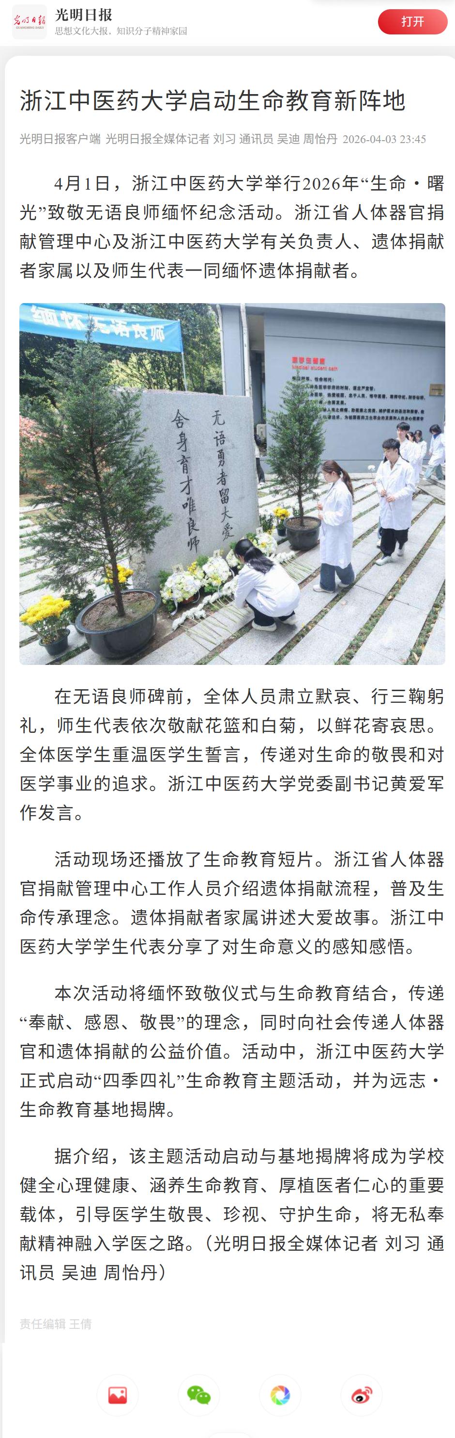 中新网浙江新闻4月3日电(张煜欢 吴迪 周怡丹)清明追思,薪火相传。近日,浙江中医药大学举行2026年“生命·曙光”致敬无语良师缅怀纪念活动。浙江省人体器官捐献管理中心和学校有关负责人,遗体捐献者家属以及师生代表一同缅怀遗体捐献者,以庄重仪式表达深切敬意。