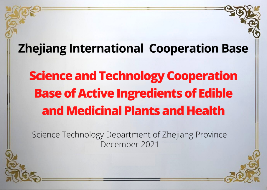 The Zhejiang International Science and Technology Cooperation Base of Active Ingredients of Edible and Medicinal Plants and Health,approved by the Science Technology Department of Zhejiang Province in 2021, is an important international cooperation platform for edible and medicinalplants research and talent training in Zhejiang with domestic and global impacts.