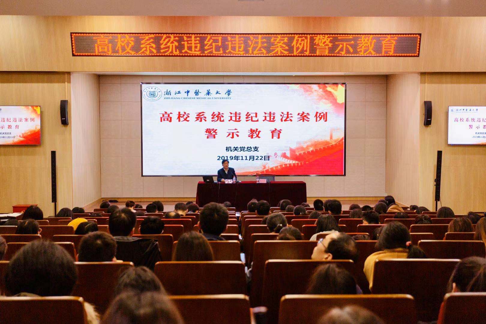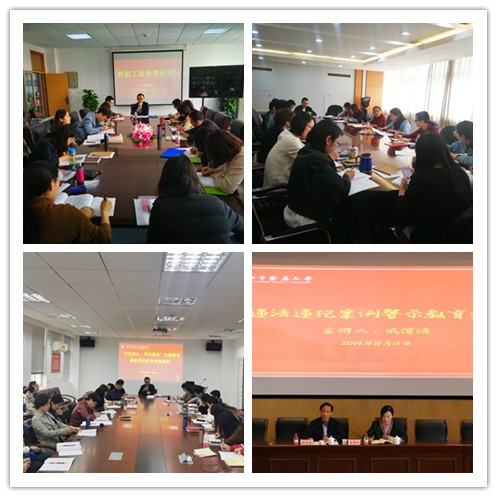 11月22日下午,校纪委书记章建生对机关党总支全体党员干部开展了警示教育。他通过基本案情介绍、处理结果、法条链接等形式,深入剖析发生在高校中违纪违法典型案例,揭示违规违纪违法问题的思想根源,释放纪律的震慑力量。他在会上强调,广大党员干部要从真真切切发生在高校系统中的鲜活案例中吸取教训,要知敬畏,存戒惧,筑牢防线,守住底线,远离红线;要明是非、辨真伪,自觉抵制各种诱惑;要管思想、固根本,不断增强纪律意识、规矩意识、责任意识,真正做到“讲政治、强党性、严纪律、守规矩”。