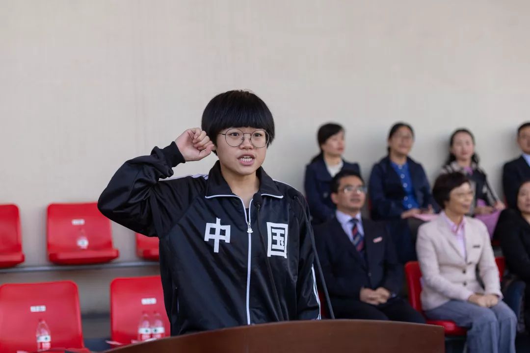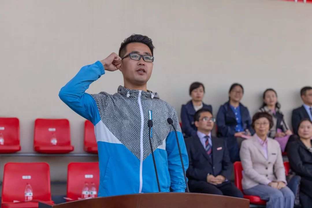 为弘扬体育精神,展现我校学子的运动竞技风尚,运动员代表闻佳敏,裁判员代表韩政老师上台宣誓。