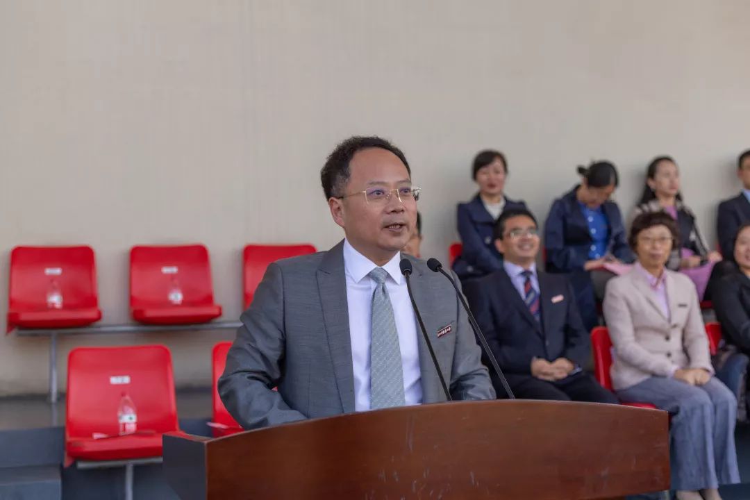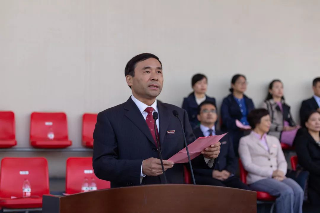 升旗礼毕后,副校长李俊伟致辞。他强调了习近平总书记“以人为本、健康第一”的教育指导思想,呼吁同学们在体育锻炼中享受乐趣,增强体质,健全人格,锤炼意志。随后,他总结了我校体育工作中的成果成就,并强调了“友谊第一,比赛第二”的竞技精神,希望全体参赛队员遵守规则,勇于争先,赛出风格,赛出品格。
