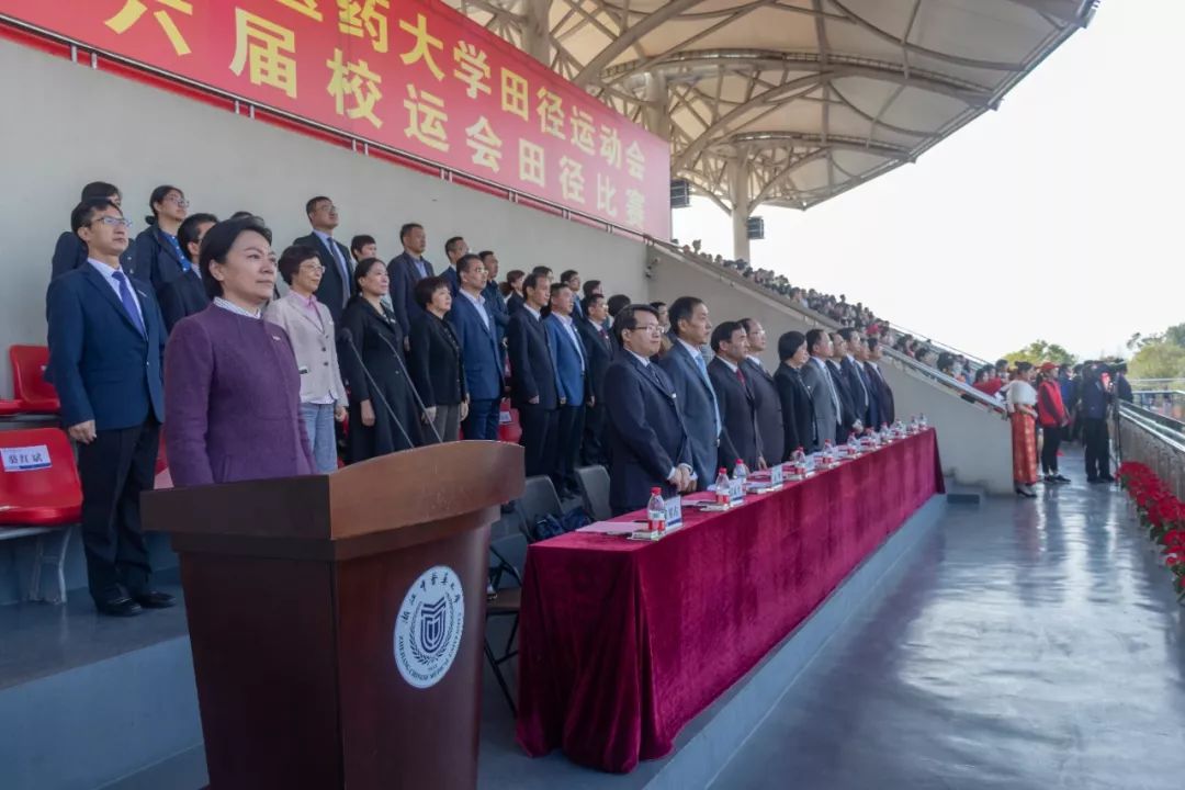 在各方阵进场完毕后,全体起立,奏唱国歌升国旗。俊朗的国旗手,冉冉升起的国旗,嘹亮的国歌,恢弘的气势展示了60岁浙江中医药大学朝气蓬勃的一面。
