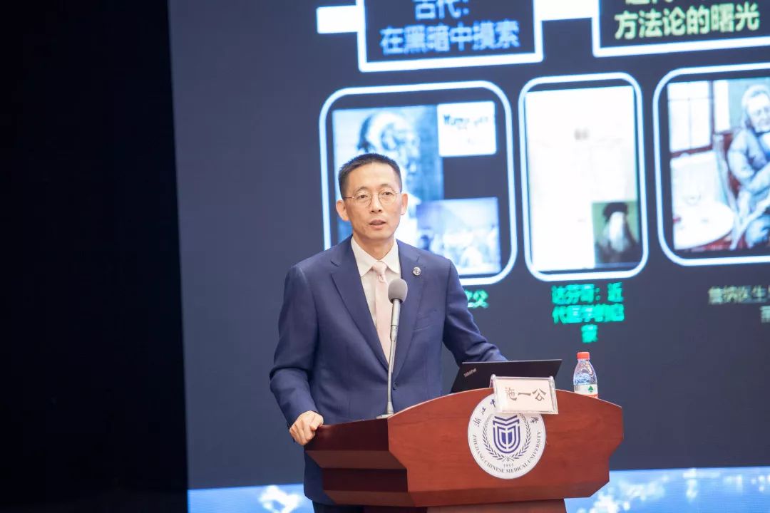 西湖大学校长施一公院士作了《前沿基础研究推动医药创新发展》的主题报告,他讲解了前沿基础研究如何推动生物医药发展,介绍了癌症的免疫疗法、基因测序、干细胞技术三个案例,以一名做基础研究的结构生物学家的身份,介绍了自己如何参与前沿基础研究,并鼓励浙中医大学子应培养批判性思维,学会解决问题的方法,以科学方法论为指导开展研究工作。