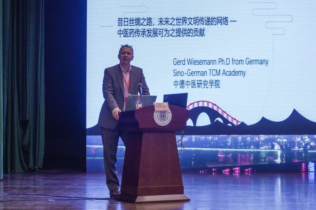 德国科隆中医药学院Gerd Wiesemann(格德·维斯曼)教授做主题报告,题目是《昔之丝绸之路,未来之世界文明传递的网络—中医药传承发展可提供的贡献》(Paths-Road-Routes from Yesterday, a Network for a Civilization Transfer for the World of Tomorrow—What Contribution Can Chinese Medicine Provide)。维斯曼教授从丝绸之路的起源,中西文化之间的交流,再谈到中医药的传承发展,充分肯定了中医药对世界人民的诸多益处,探讨了中医药传承发展可为世界文明作出的贡献,为中医药的传承发展提供了独到的见解。