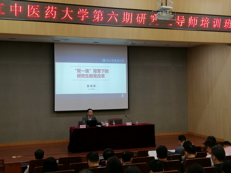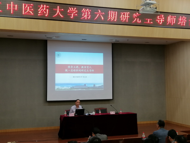 培训班安排了3场专题报告和3场专题讲座:张元龙副书记作题为《修身立德,教书育人,做一名称职的研究生导师》的专题报告,张光霁副校长作题为《“双一流”背景下的研究生教育改革》的专题报告,华东师范大学心理与认知科学学院刘永芳教授作题为《新时期研究生培养过程中的师生关系》的专题报告,研工部部长、研究生院院长袁强作了题为《如何指导一篇合格的学位论文》的讲座,实验室与设备管理处处长王辉作了题为《科研实验安全管理规范》的讲座,附属第一医院副院长杨珺超作了题为《规培研究生带教管理经验分享》的讲座。博士生导师、浙江省中医院叶宝东教授,硕士生导师、浙江省新华医院段跃主任医师作为新任导师代表在结业式上发言。