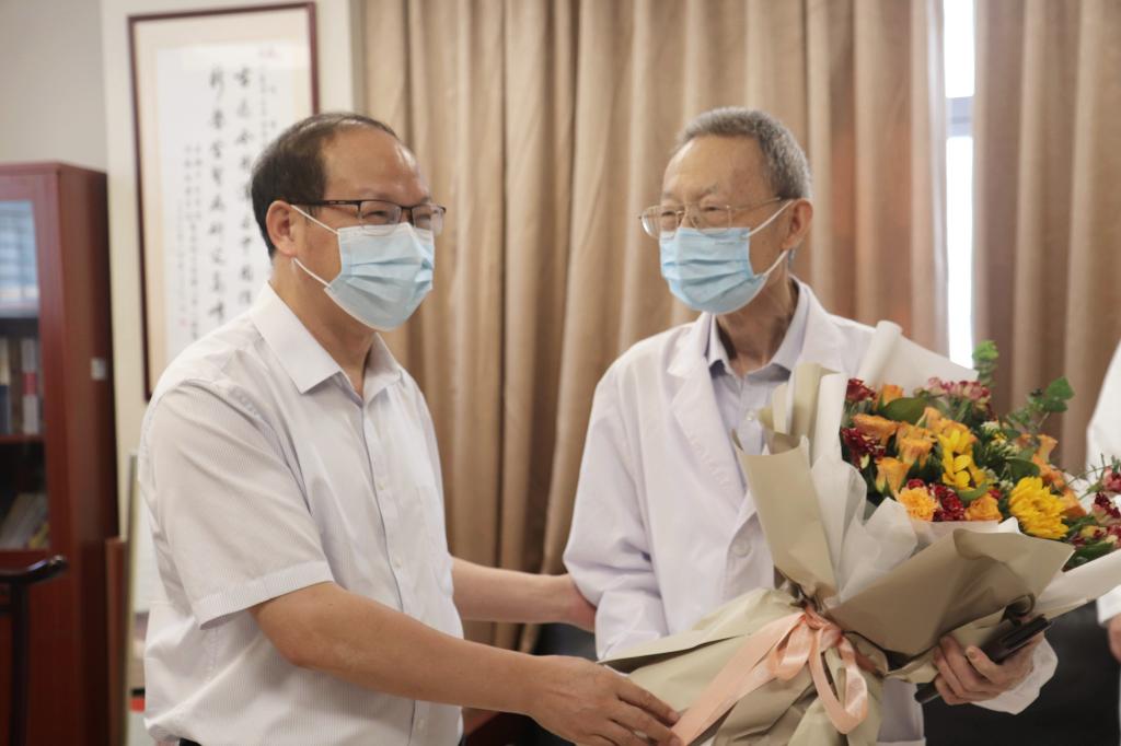 陈忠、温成平走访了附属第二医院(浙江省新华医院)急诊科、骨科,向医护代表送上鲜花和蛋糕,并祝他们医师节快乐。随后,陈忠一行走访了附属第三医院(浙江省中山医院)针灸科、椎间盘科病房、急诊科和名中医馆,与医护人员亲切交谈,询问他们的工作和生活情况。