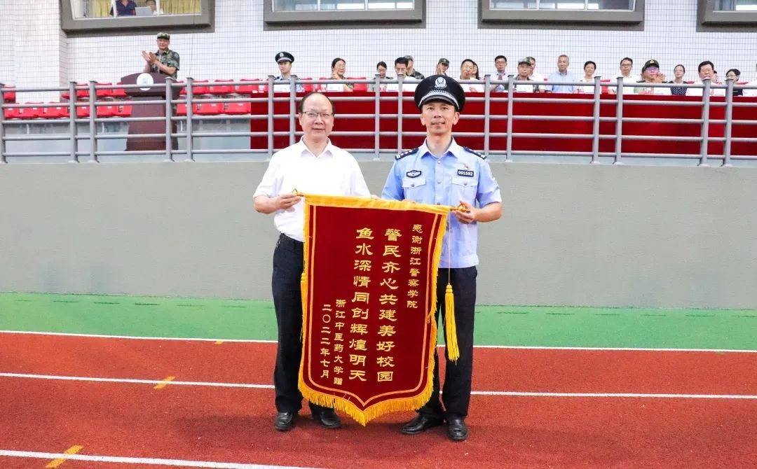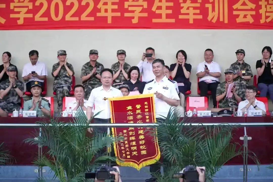 校党委书记黄文秀、校长陈忠分别在滨文校区和富春校区为浙江警察学院赠送锦旗,对他们给予我校军训工作的大力支持表示感谢。