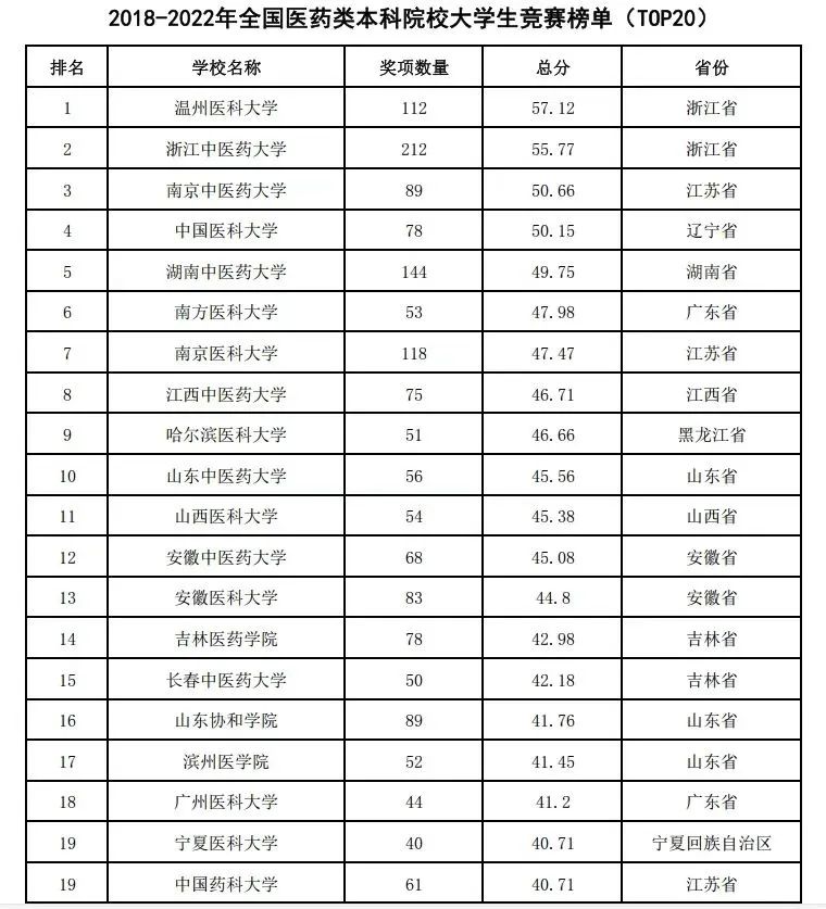 3月22日,中国高等教育学会高校竞赛评估与管理体系研究专家工作组发布《2022全国普通高校大学生竞赛分析报告》,在2018-2022年全国医药类本科院校大学生竞赛榜单(TOP20)中,我校排名位列全国医药院校第2位、全国中医药院校第1位。同时,我校再次进入2018-2022全国普通高校大学生竞赛榜单(本科TOP300)。