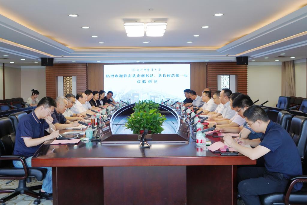 7月11日,磐安县委副书记、县长何浩挺一行来校调研。校党委书记黄文秀、副校长吴承亮出席座谈会,办公室、研究生院、人事处、科研部、医院管理处、社会合作处等相关部门负责人参加会议。