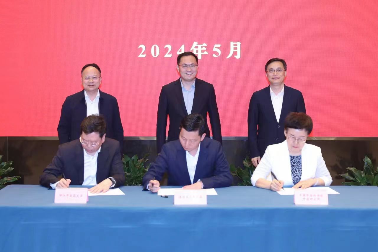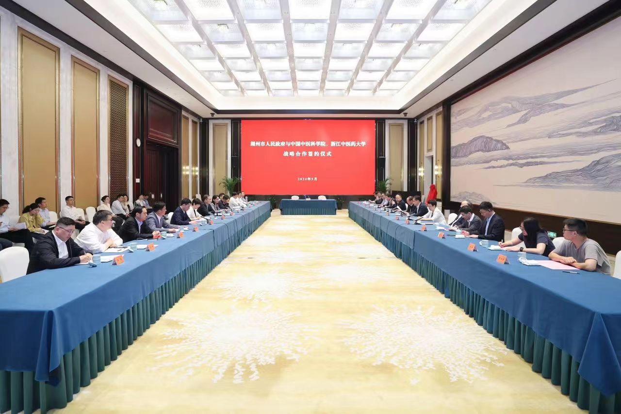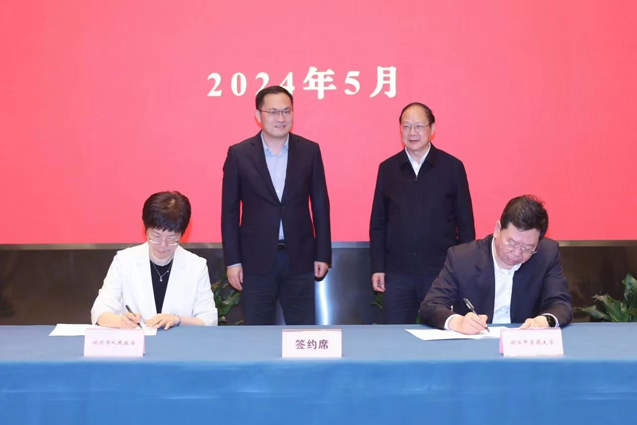 5月11日下午,我校与湖州市人民政府、中国中医科学院战略合作签约仪式在湖州市举行,三方将共建中药生态研究院(道地药材品质保障与资源持续利用全国重点实验室)。国家中医药管理局副局长、中国中医科学院院长、中国工程院院士黄璐琦,中国中医科学院中药研究所所长、全国重点实验室主任郭兰萍,湖州市委副书记、市长洪湖鹏,湖州市委常委、副市长阮叶萍,湖州市副市长石一婷,德清县委副书记、代县长王剑峰,学校党委书记黄文秀、校长陈忠、副校长吴承亮等出席签约仪式。中国中医科学院、湖州市和我校相关单位负责人参加仪式。签约仪式由石一婷主持。