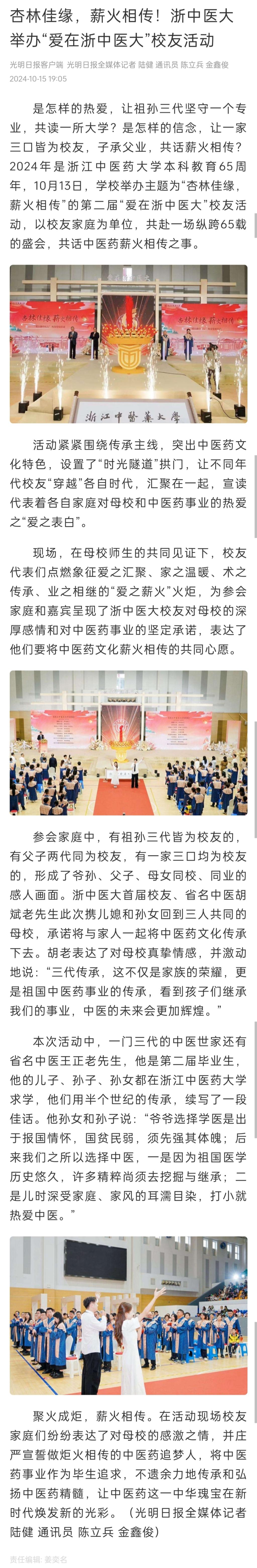是怎样的热爱,让祖孙三代坚守一个专业,共读一所大学?是怎样的信念,让一家三口皆为校友,子承父业,共话薪火相传?2024年是浙江中医药大学本科教育65周年,10月13日,学校举办主题为“杏林佳缘,薪火相传”的第二届“爱在浙中医大”校友活动,以校友家庭为单位,共赴一场纵跨65载的盛会,共话中医药薪火相传之事。
