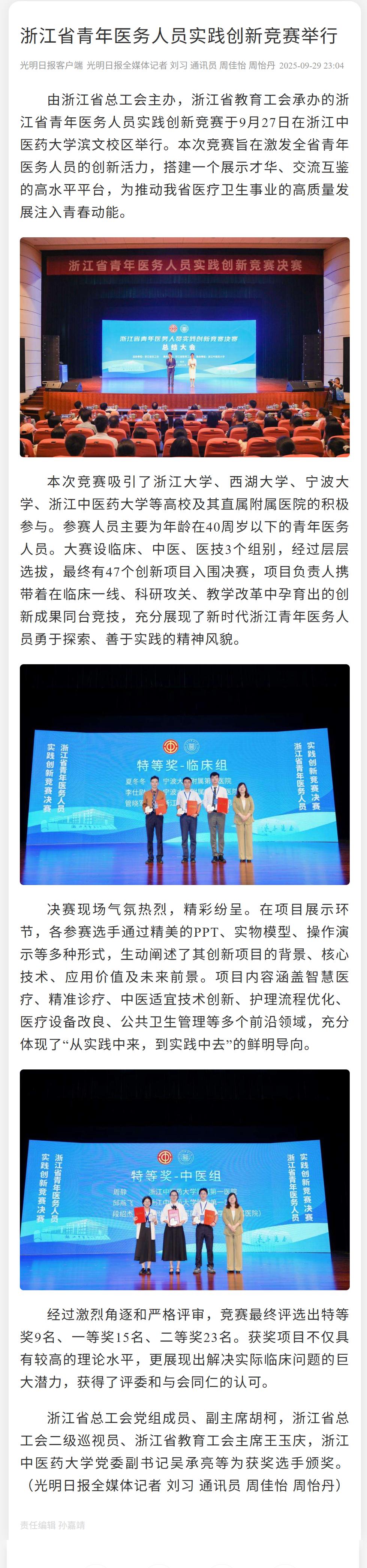 由浙江省总工会主办,浙江省教育工会承办的浙江省青年医务人员实践创新竞赛于9月27日在浙江中医药大学滨文校区举行。本次竞赛旨在激发全省青年医务人员的创新活力,搭建一个展示才华、交流互鉴的高水平平台,为推动我省医疗卫生事业的高质量发展注入青春动能。