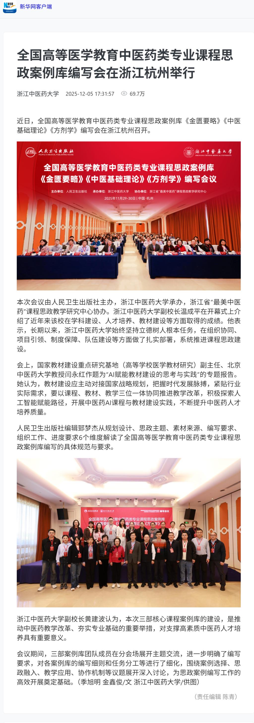 新华网:全国高等医学教育中医药类专业课程思政案例库编写会在浙江杭州举行
