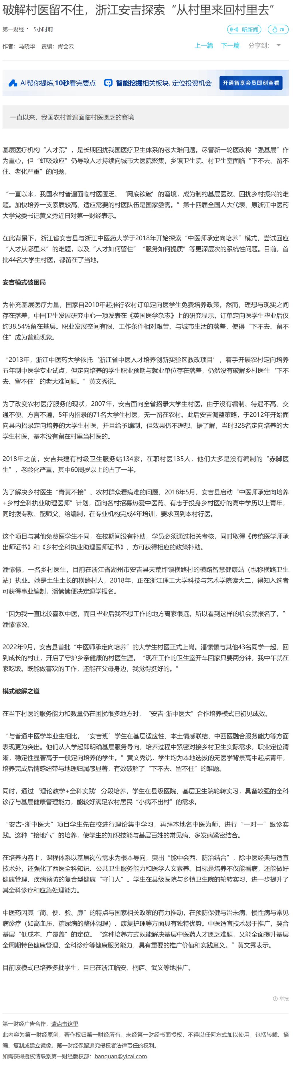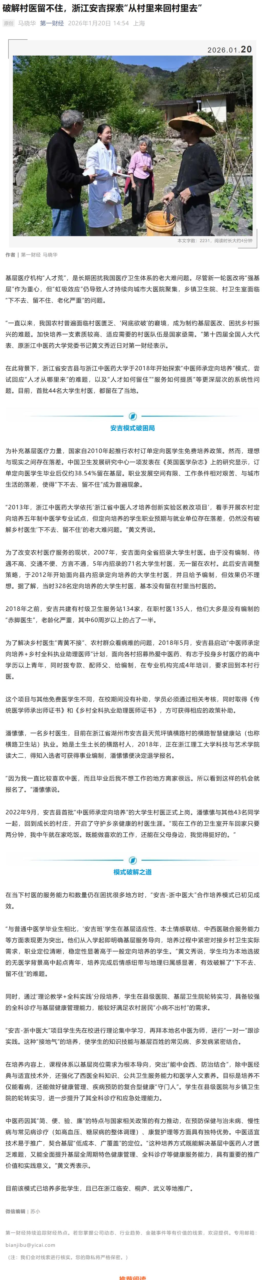在此背景下,浙江省安吉县与浙江中医药大学于2018年开始探索“中医师承定向培养”模式,尝试回应“人才从哪里来”的难题,以及“人才如何留住”“服务如何提质”等更深层次的系统性问题。目前,首批44名大学生村医,都留在了当地。