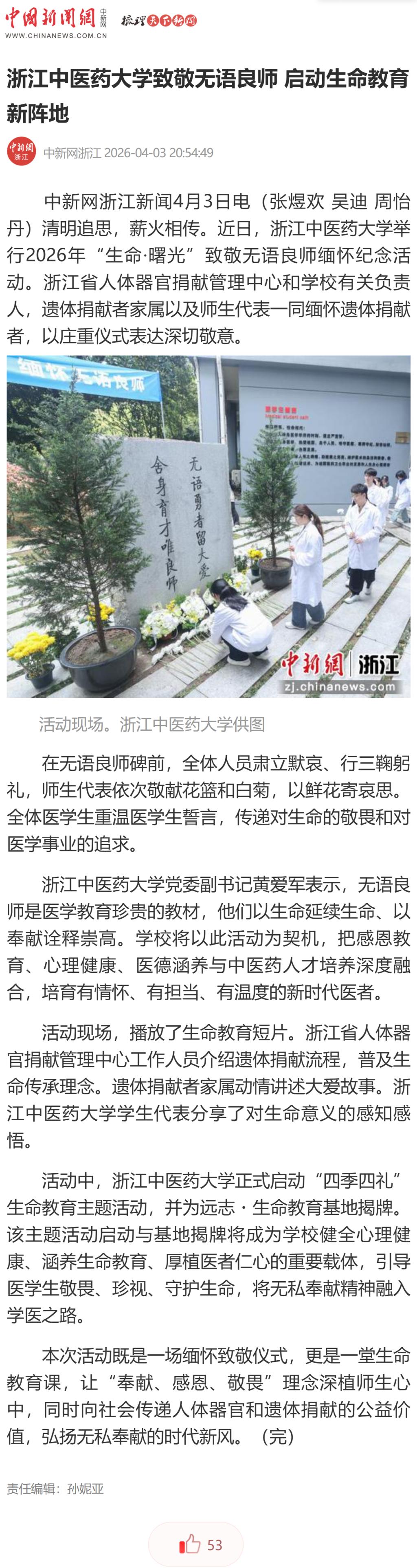 中新网浙江新闻4月3日电(张煜欢 吴迪 周怡丹)清明追思,薪火相传。近日,浙江中医药大学举行2026年“生命·曙光”致敬无语良师缅怀纪念活动。浙江省人体器官捐献管理中心和学校有关负责人,遗体捐献者家属以及师生代表一同缅怀遗体捐献者,以庄重仪式表达深切敬意。